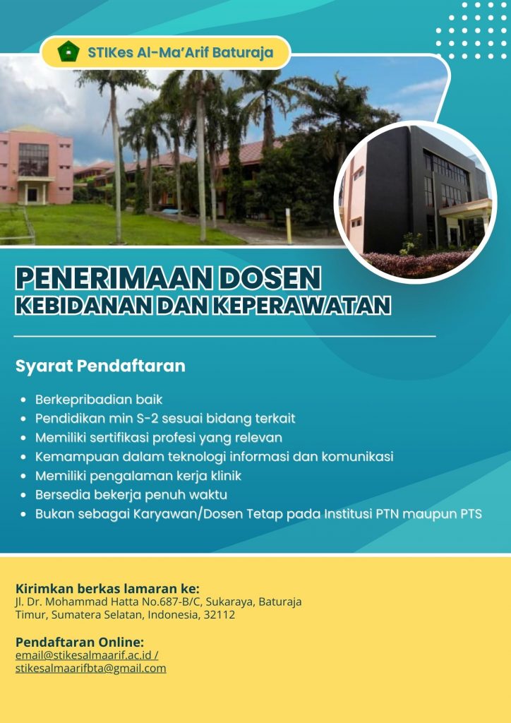 Sekolah Tinggi Ilmu Kesehatan Al-Ma’arif Baturaja membuka kesempatan dan peluang karier bagi Tenaga Dosen Kebidanan dan Keperawatan.