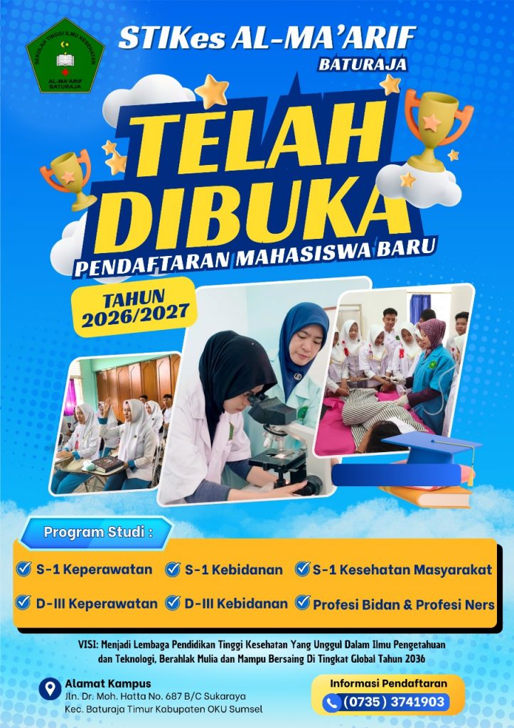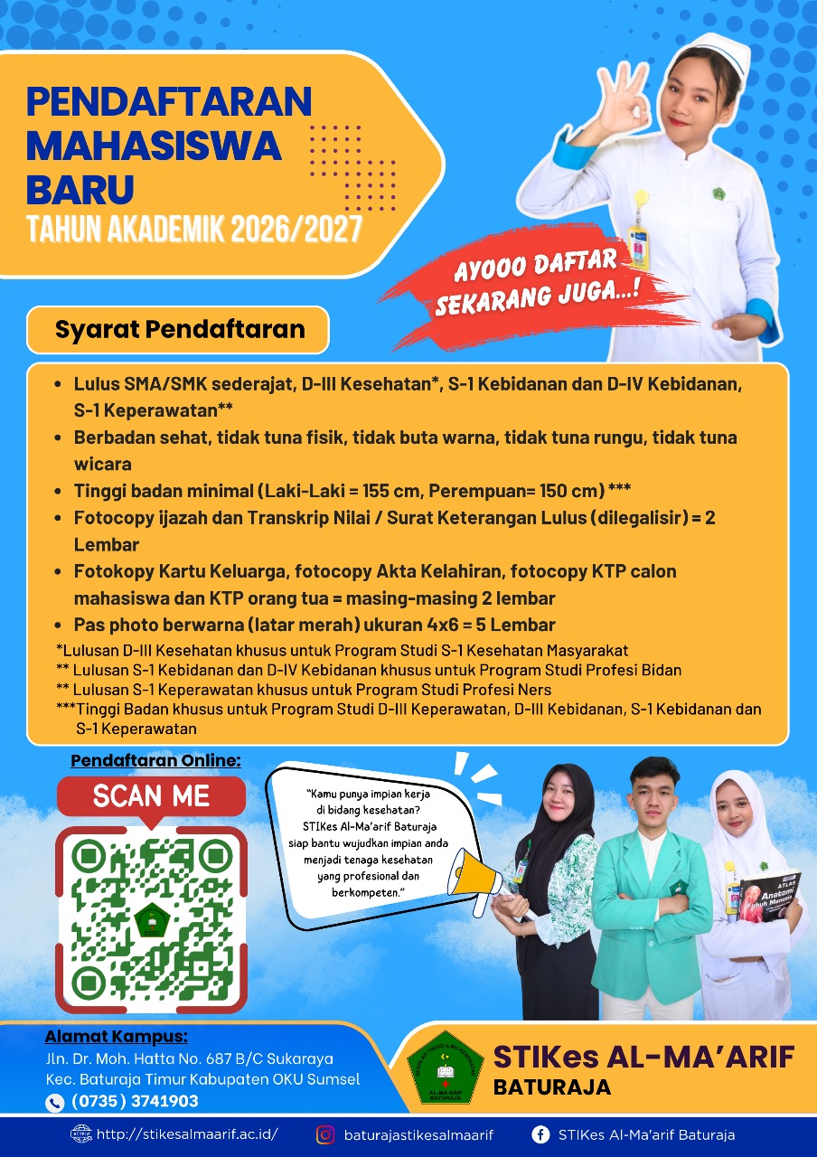 Penerimaan Mahasiswa Baru STIKes Al-Ma’arif Baturaja Tahun Akademik 2026/2027 telah dibuka mulai bulan Desember 2025.